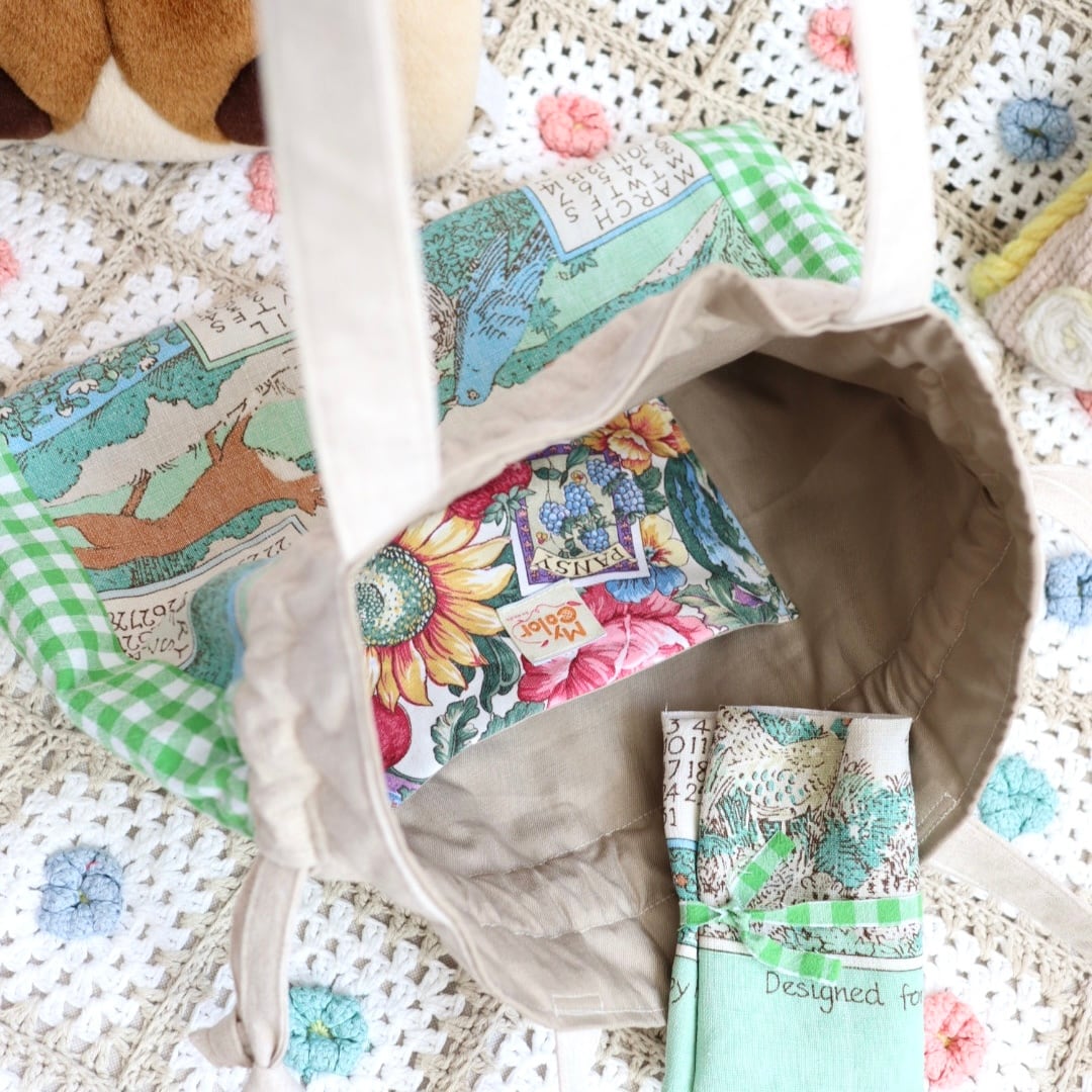 カレンダー生地は残布を同封しておりますが、作品に全面配置ができたカレンダーbagには内ポケットの共布のご用意となります。