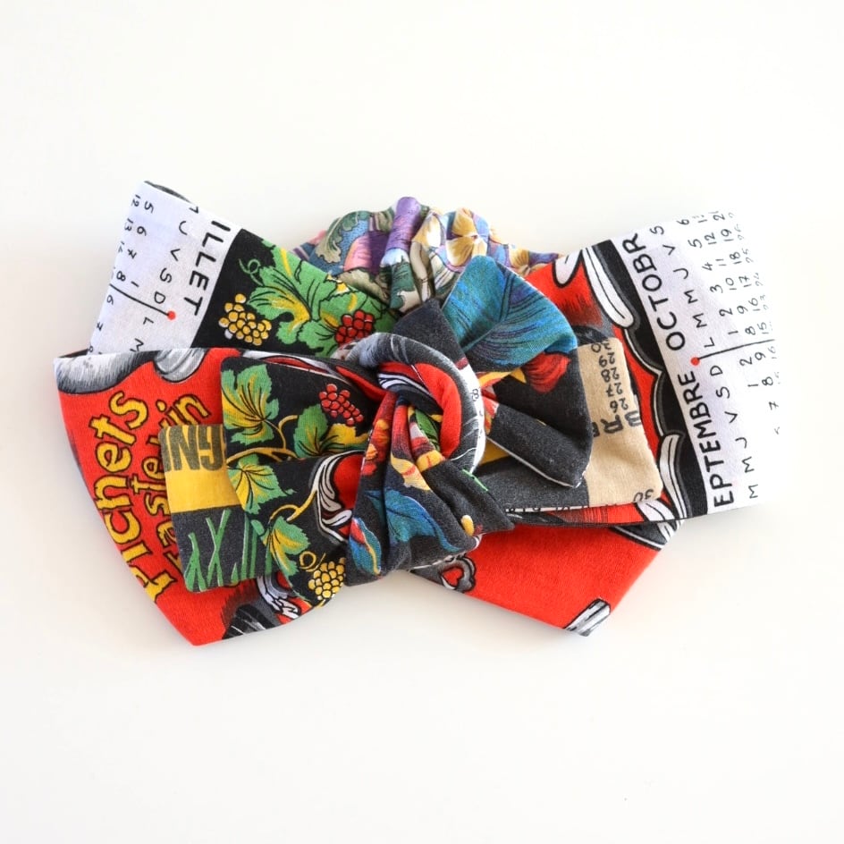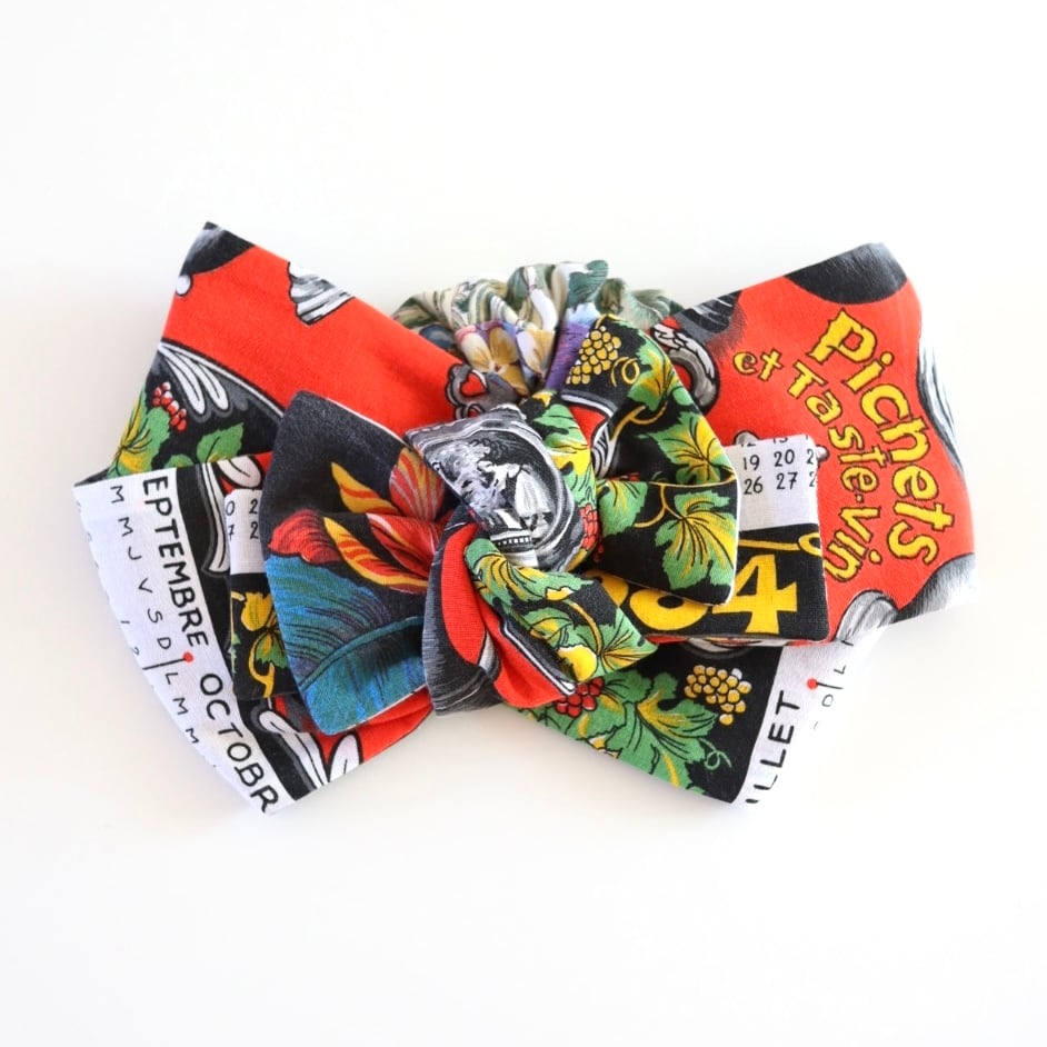 ビンテージのキッチンクロスやファブリックカレンダーを組み合わせてリメイクした一点もののヘアバンド。