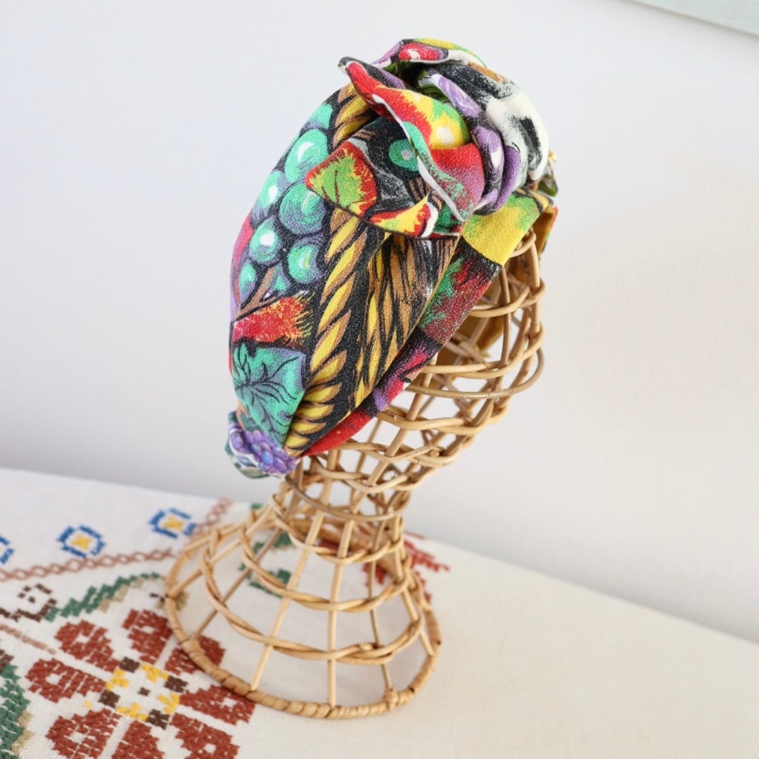 ビンテージのキッチンクロスを組み合わせてリメイクした一点もののヘアバンド。