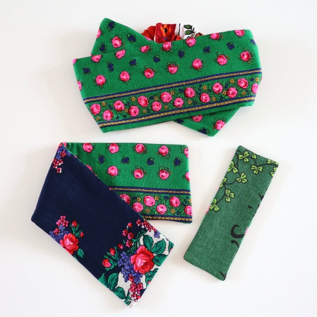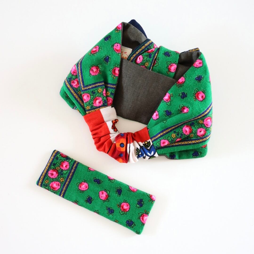 色鮮やかなプラトークのusedスカーフをベースに制作しています。ロシアのスーベニアアイテムで大きな花の大胆なプリントが特徴的です。こちらは薄手ウール素材ではありますが、秋冬にはもちろん春の装いにもぴったりなので夏以外のシーズンに活躍できるアイテムなのも嬉しいポイント。