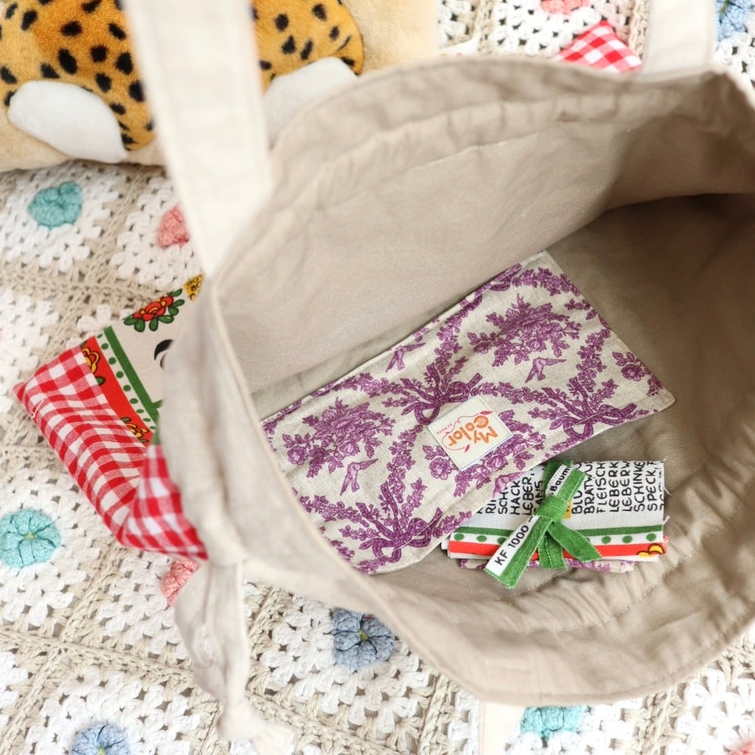 持ち手を長くし横長デザインなのでアウターを着ても肩に掛けやすく、巾着を絞った状態でも中身が取り出しやすい形です。