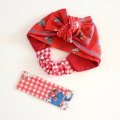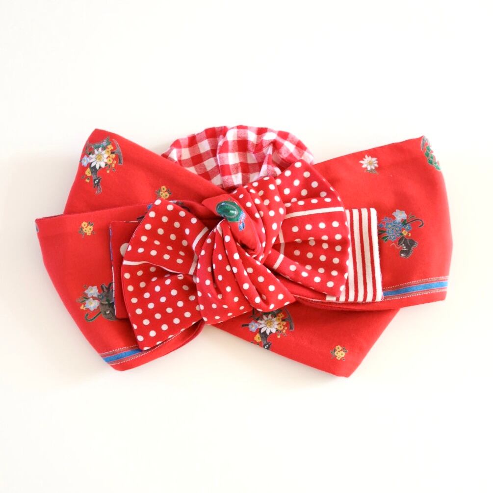 Euroの古着バンダナをリメイクしたヘアバンド。チロルな雰囲気と赤のギンガムチェックを組み合わせています。