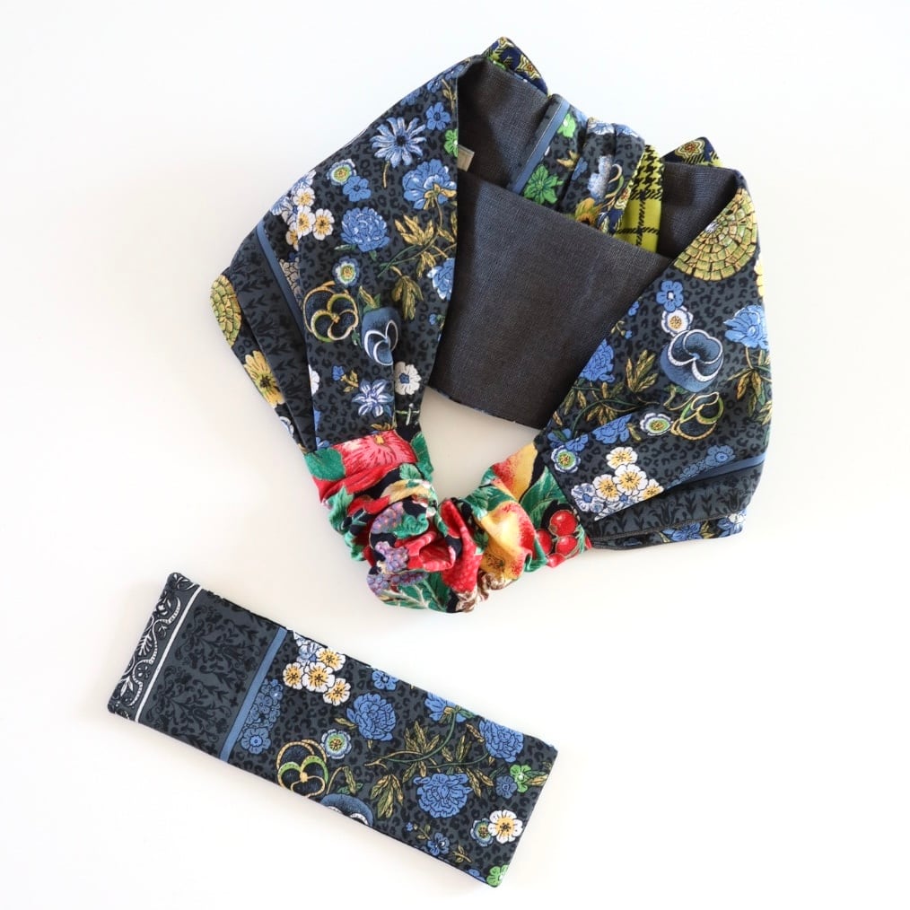 Euroの古着ストールをリメイクしたヘアバンド。秋冬の装いにも馴染みがよさそうなカラーリングとusedならではの柄の出方が特徴です。