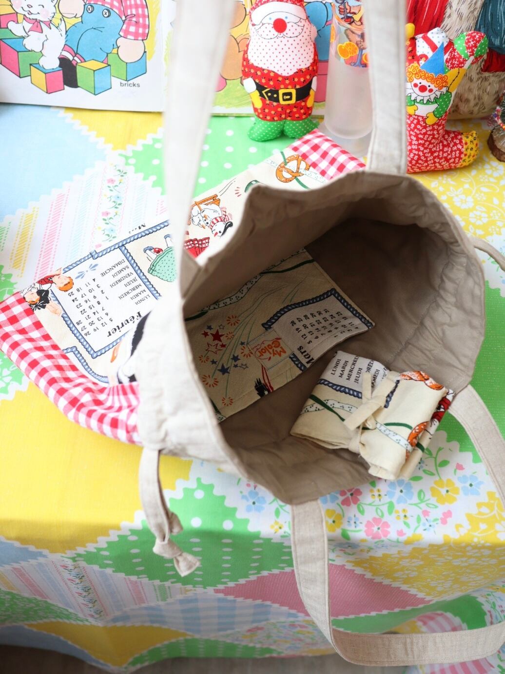 カレンダー生地は残布を同封しておりますが、作品に全面配置ができたカレンダーbagには内ポケットの共布のご用意となります。