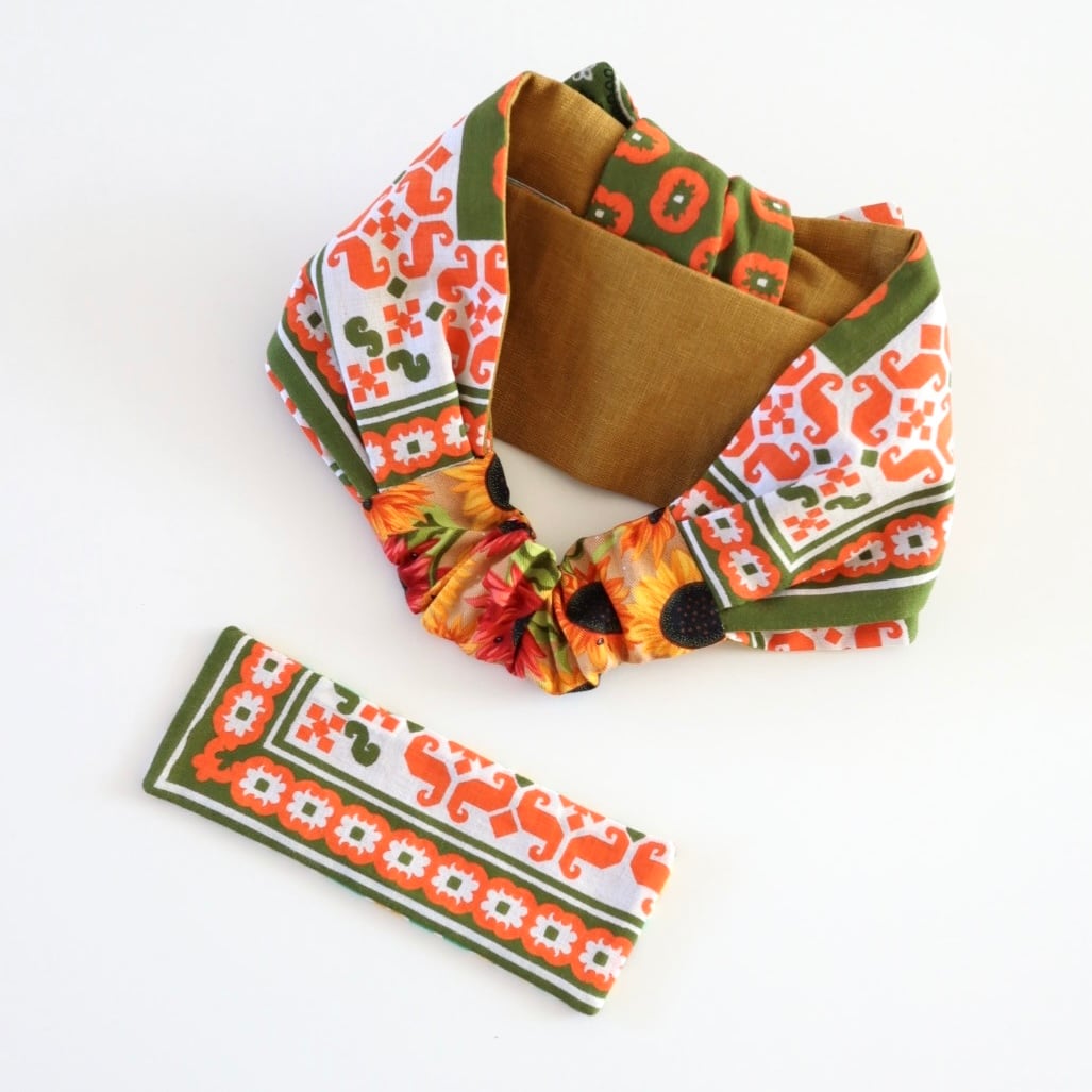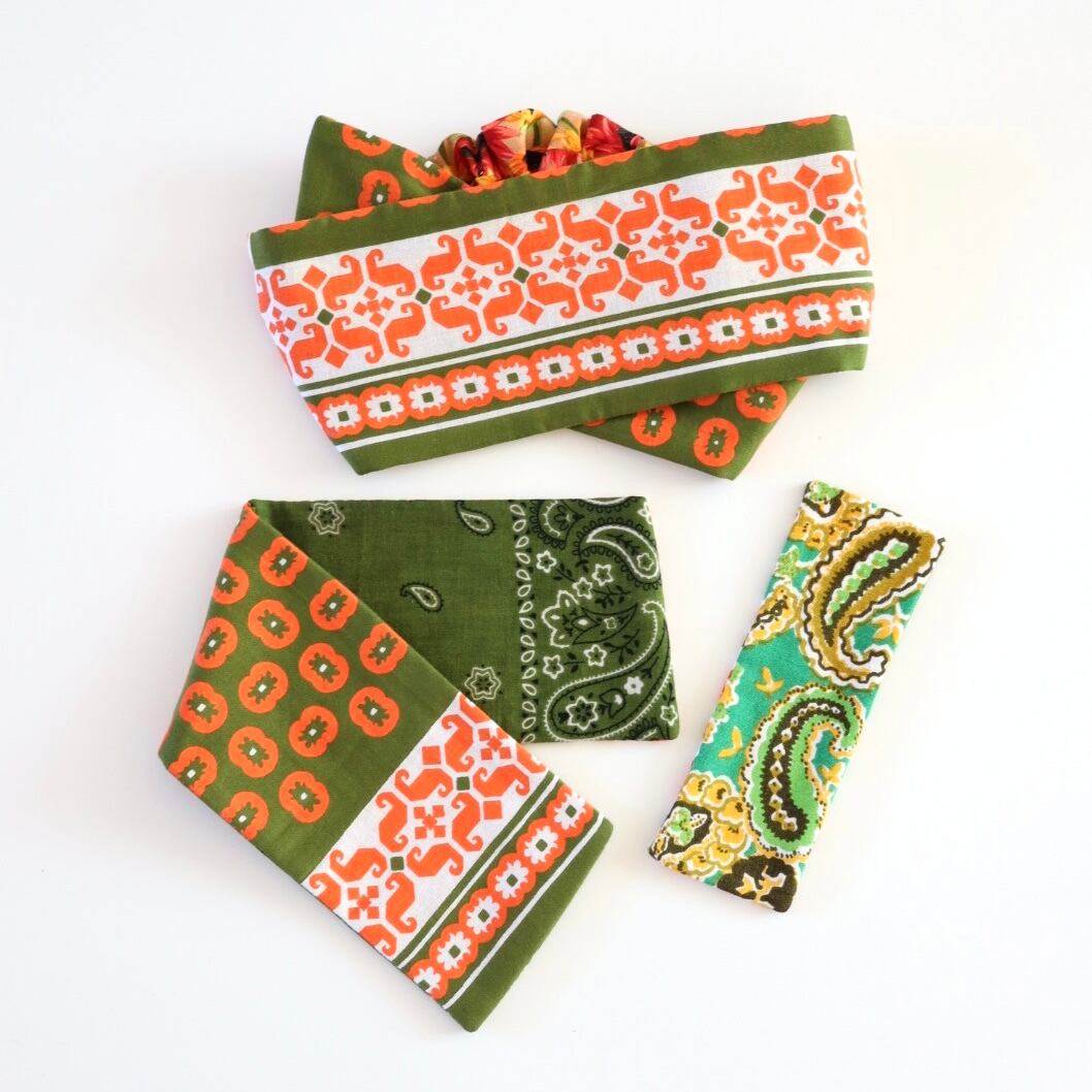 古着のコットンバンダナをメインに制作したリボンヘアバンド。usedバンダナ独特のカラーリングと風合いがあり,バンダナを巻いたイメージが簡単にリボンに整うヘアバンドです。