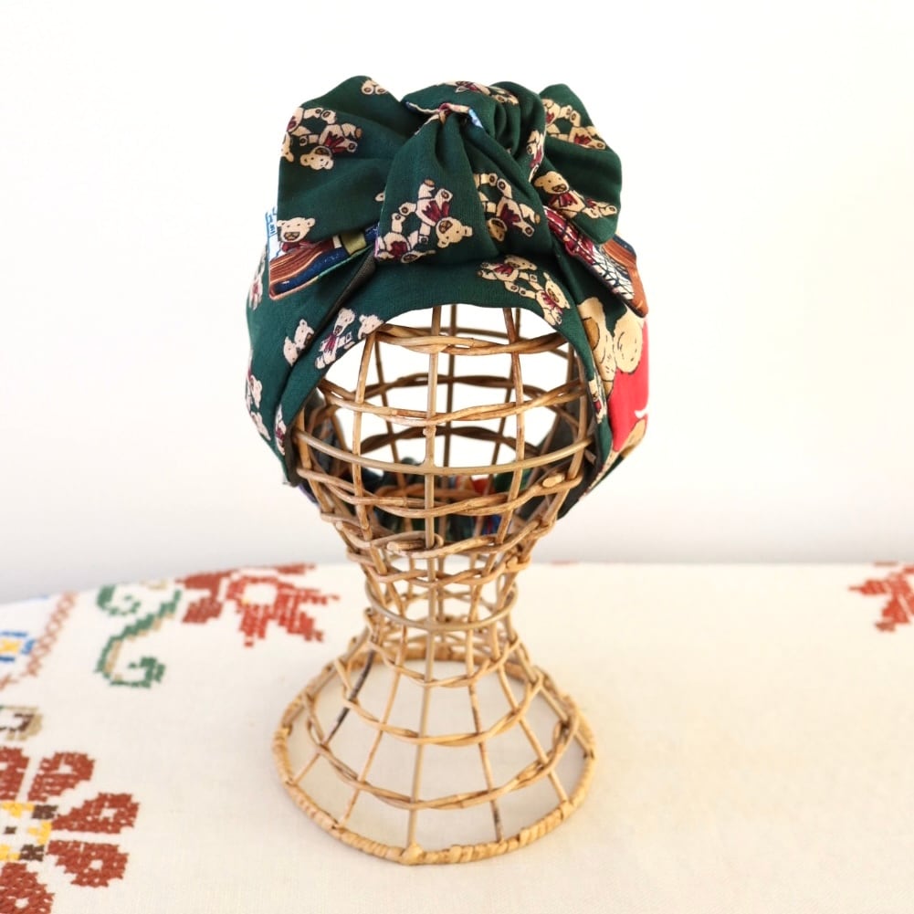 古着のコットンバンダナをメインに制作したリボンヘアバンド。usedバンダナ独特のカラーリングと風合いがあり,バンダナを巻いたイメージが簡単にリボンに整うヘアバンドです。
