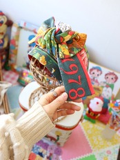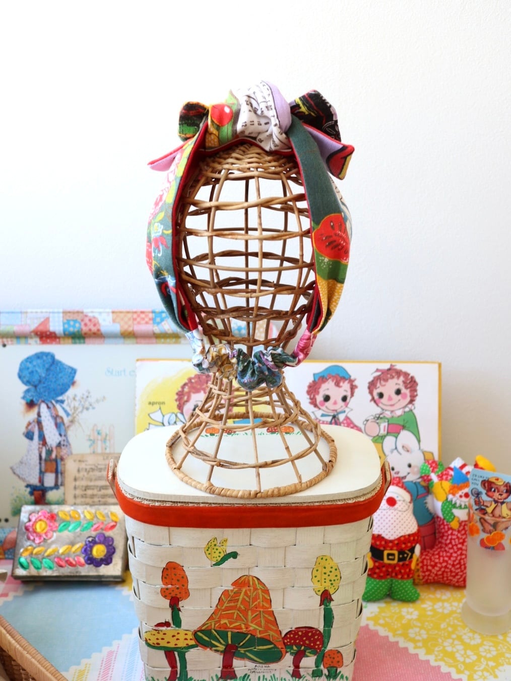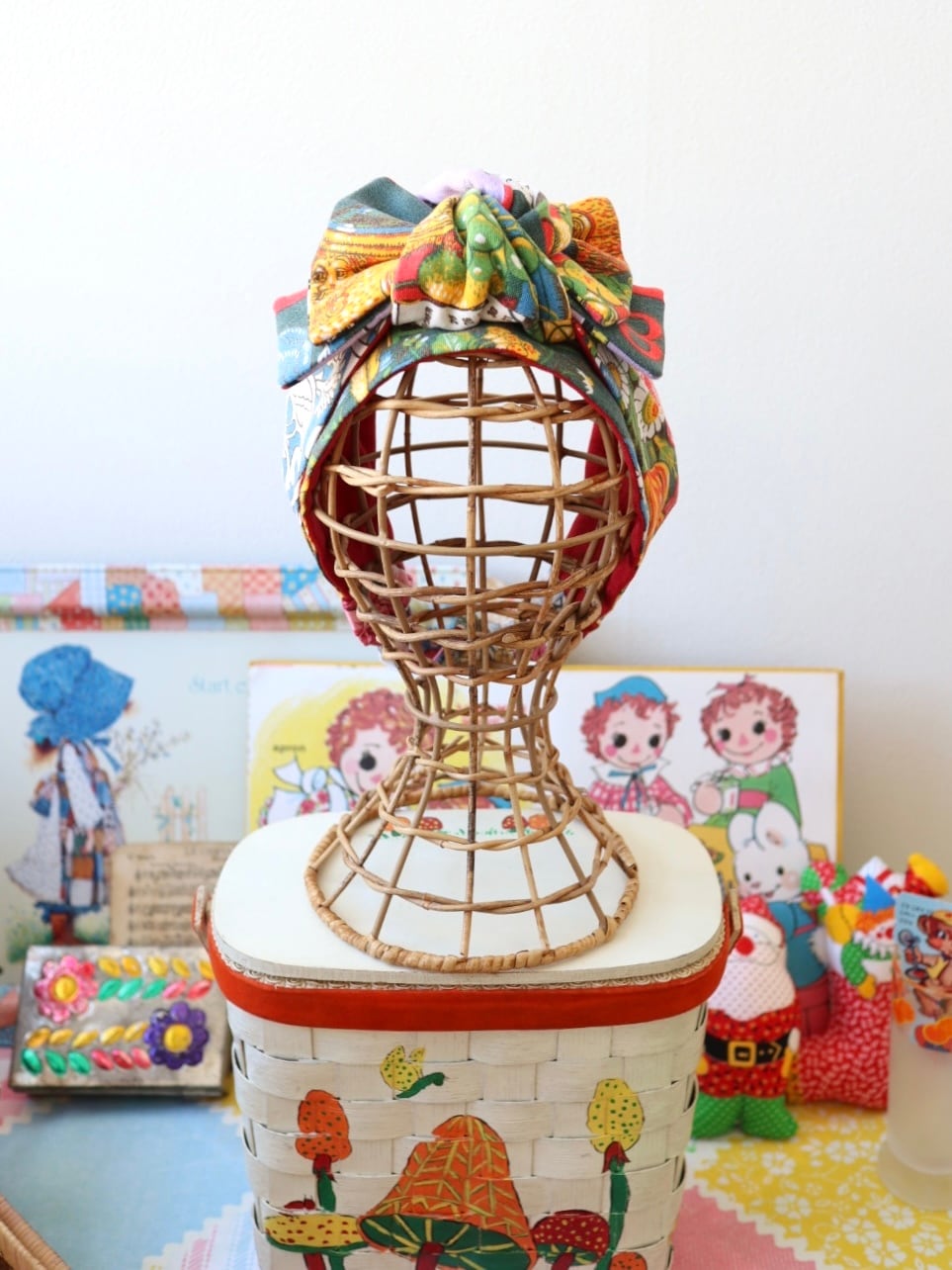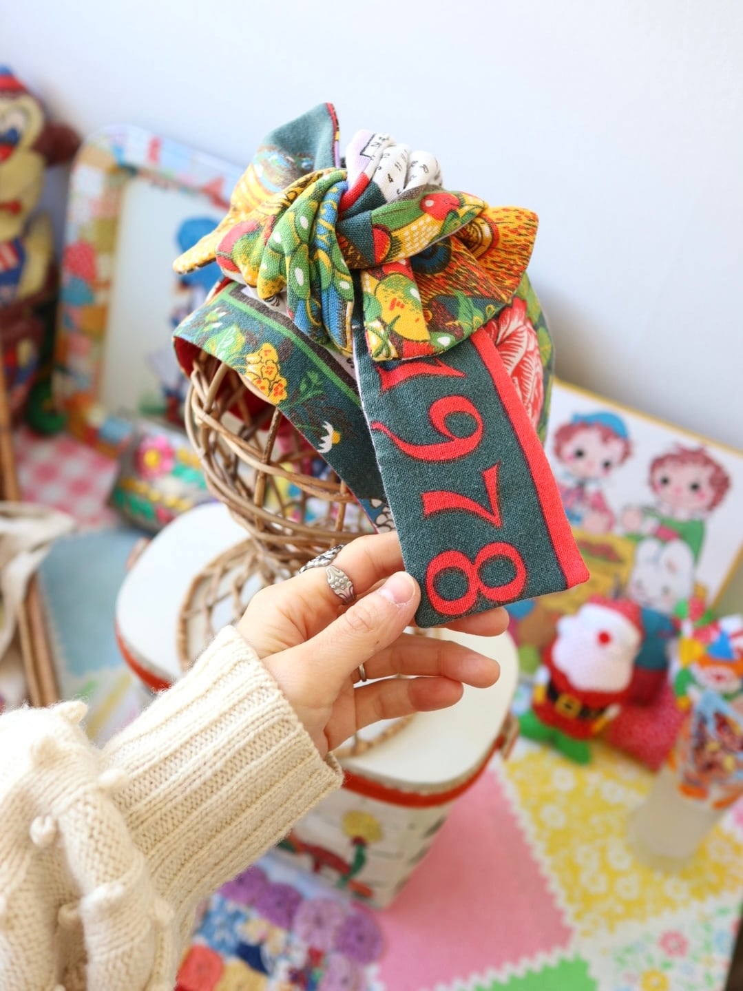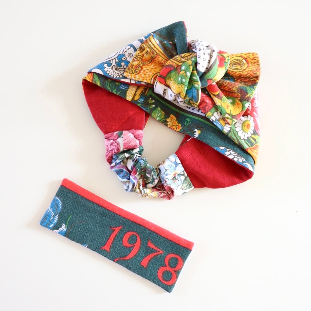 ビンテージのキッチンクロスやファブリックカレンダーを組み合わせてリメイクした一点もののヘアバンド。